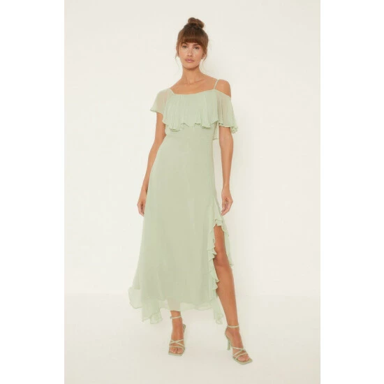 Elevated with asymmetric and ruffle detailing, this modern bridesmaid dress is made with special occasions in mind. Complete with a flirty side split and gently nipped-in waist to create a feminine look. Model wears a size 10. This garment is part of our Conscious Clothing rangeIt is made with responsibly sourced viscose, helping to protect our world’s forests.Find out more about our material goalsConscious Clothing Guidelines