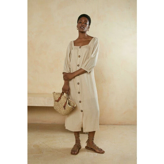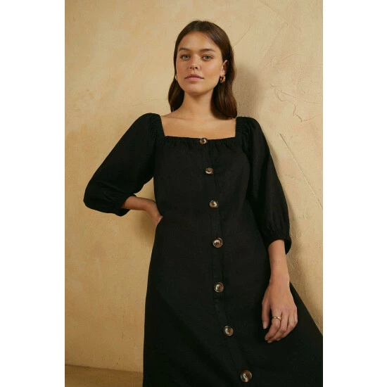 Main: 70% Viscose. 30% Linen. Lining: 100% Polyester. Dress Length 125cm. Model Wears Size 8.