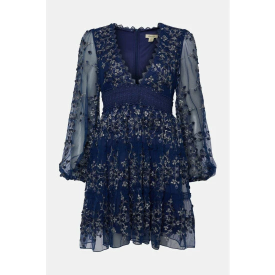 Style: Skater DressDesign: EmbroideredFabric: WovenLength: MiniNeckline: V NeckSleeve Length: Long SleeveDiscover our full range of women’s bridesmaid dresses