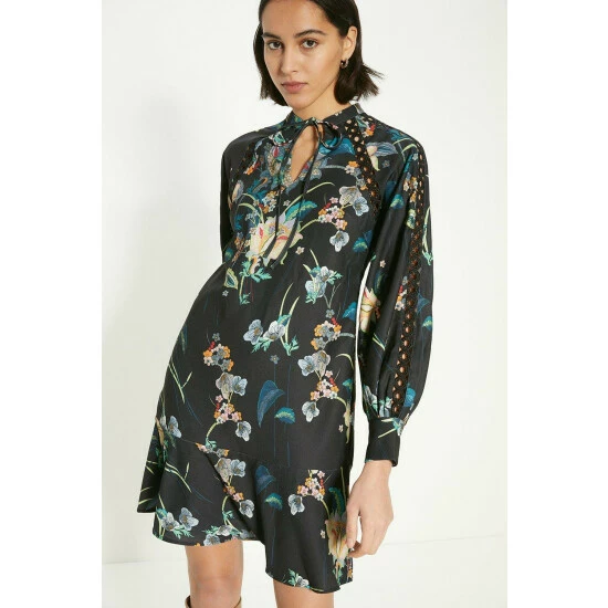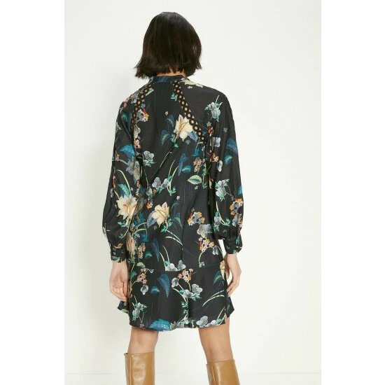 Style: Mini DressDesign: FloralFabric: CrepeLength: MiniNeckline: High NeckSleeve Length: Short Sleeve