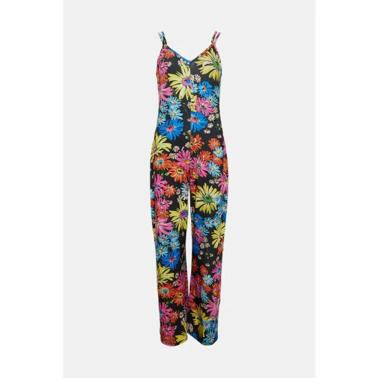Whatever the styling dilemma, allow this easy-to-wear jumpsuit to solve all your wardrobe worries. Its strappy style, V-neckline and wide leg silhouette creates an effortlessly cool look, whilst its bold floral print is sure to turn heads. Dress up with bold accessories and heels, or dress down with a denim jacket and trainers for endless wearability.This garment is part of our Conscious Clothing rangeIt is made with recycled polyester.Find out more about our material goalsConscious Clothing Guidelines