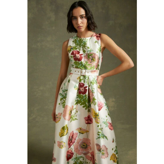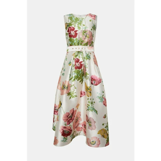 Style: Midi DressDesign: FloralFabric: SatinLength: MidiNeckline: CrewSleeve Length: Short Sleeve