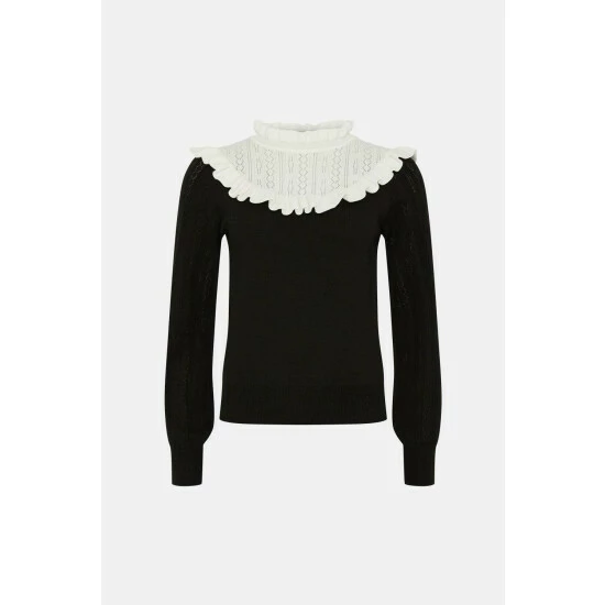 Detailed with a feminine yoke detailing with directional frills, allow this statement jumper to add an instant wow factor to winter looks. Designed in a regular fit with long sleeves and a high neckline, contrast the vintage-inspired femininity by pairing with directional leather separates. Model wears a size 10. Discover our full range of women’s knitwear