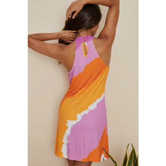Showing off a bold tie-dye print, this dress is designed in a mini length with a high neckline, open back and breezy side split. Made perfectly for warm-weather wearing, simply style with heeled gladiator sandles and subtle gold jewellery for an elevated look. Model wears a size 10.