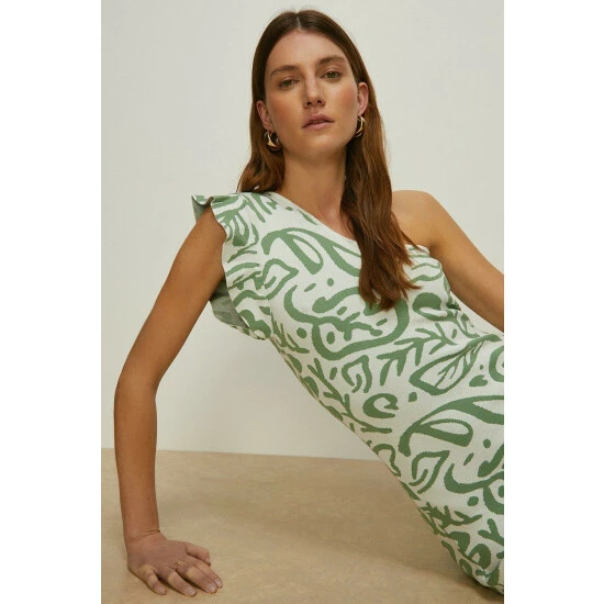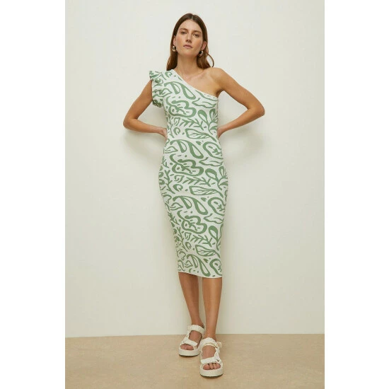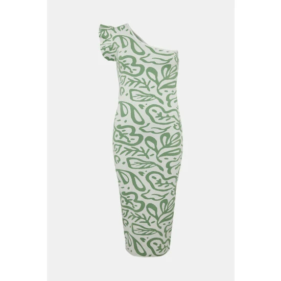 Style: Bodycon DressDesign: All Over PrintFabric: KnittedLength: MidiNeckline: One ShoulderSleeve Length: Sleeveless