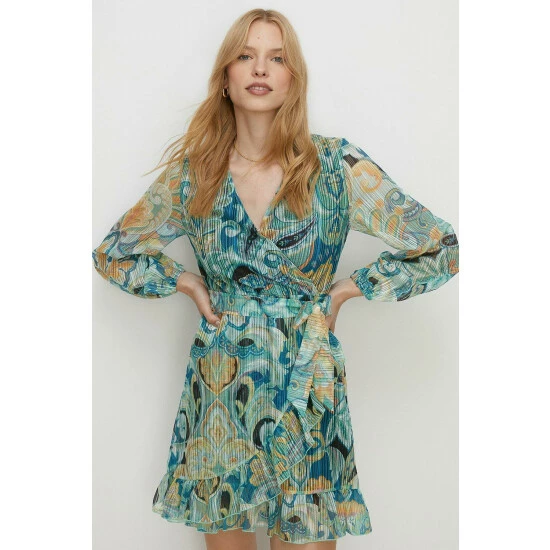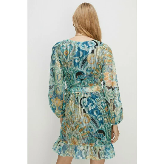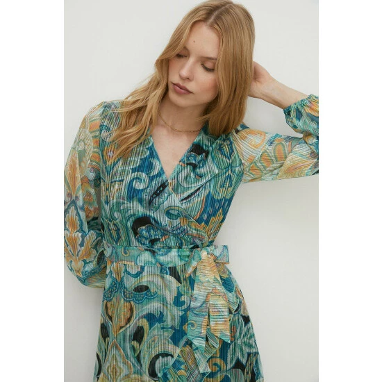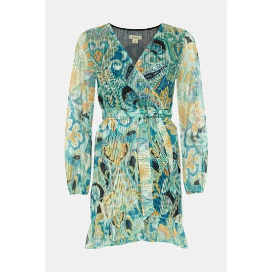 Beautifully crafted in a plisse fabric, this dress shows off a mock wrap style to create a flattering fit that shows off your waist. Complete with a V-neckline and sheer balloon sleeves, it comes complete with an all-over print. Pair with metallic accessories for a chic evening-ready look. Model wears a size 10.