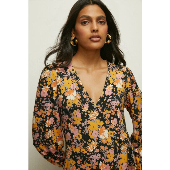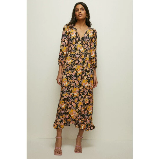 Style: Midi DressDesign: FloralFabric: JerseyLength: MidiNeckline: WrapSleeve Length: Long Sleeve