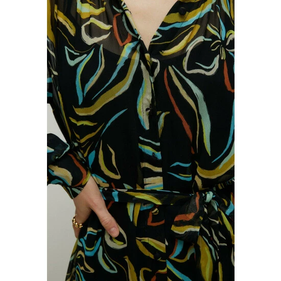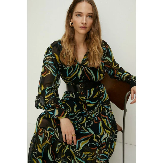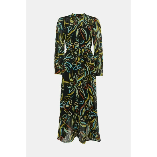 Meet your new everyday staple. Designed in a classic shirt style, it features a collared neckline, button front, long sleeves and a midi length. Complete with an all-over leafy floral print and matching belt to cinch in silhouettes. Pair with low block heels or strappy sandals for endless wearability. Model wears a size 10.