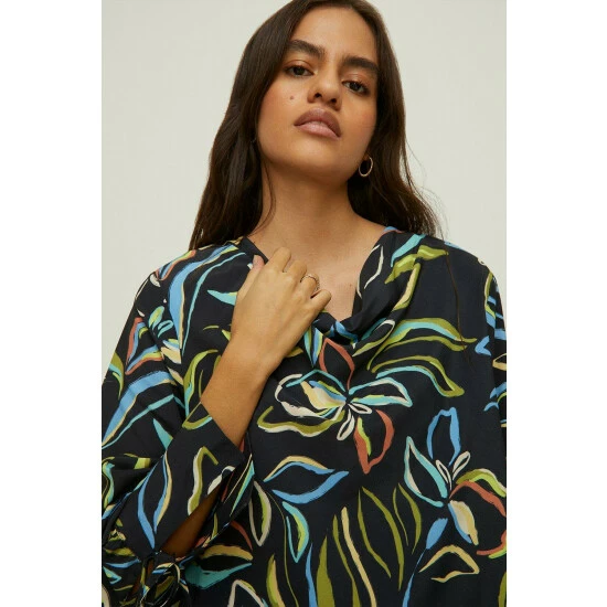 With it’s timeless cowl neckline and flowing fit, this blouse makes for an elegant addition to love-forever wardrobes. Complete with an all-over leaf design in a unique style, pair with wide leg denim and heeled ankle boots for a chic look. Model wears a size 10.