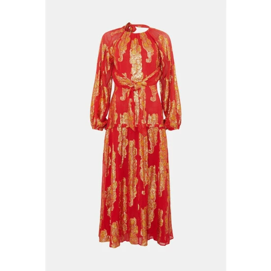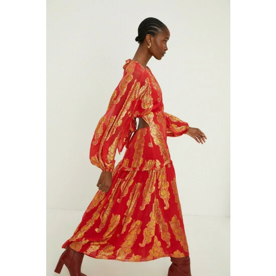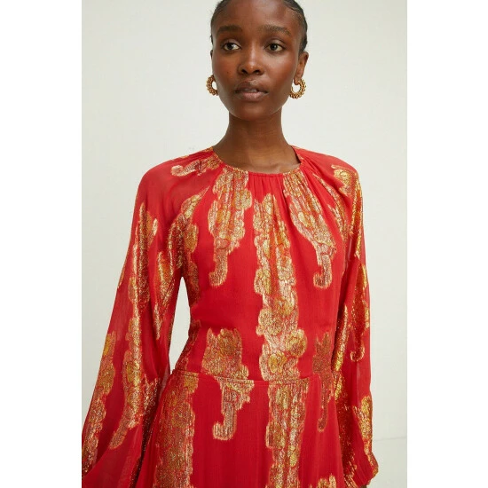 Main: 83% Viscose 17% Metallic Fibre, Lining: 100% Polyester. Machine Wash. Dress length 132cm. Model Wears Size 10.