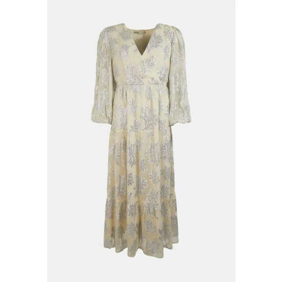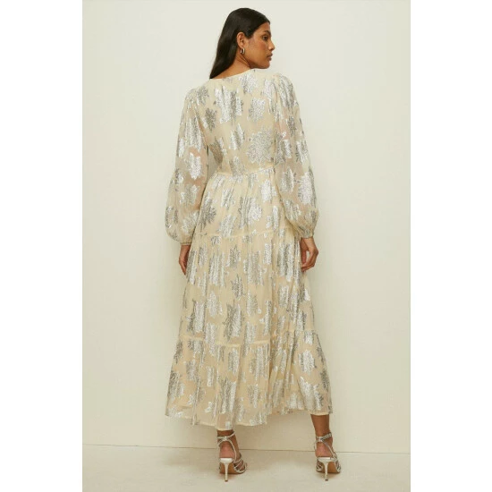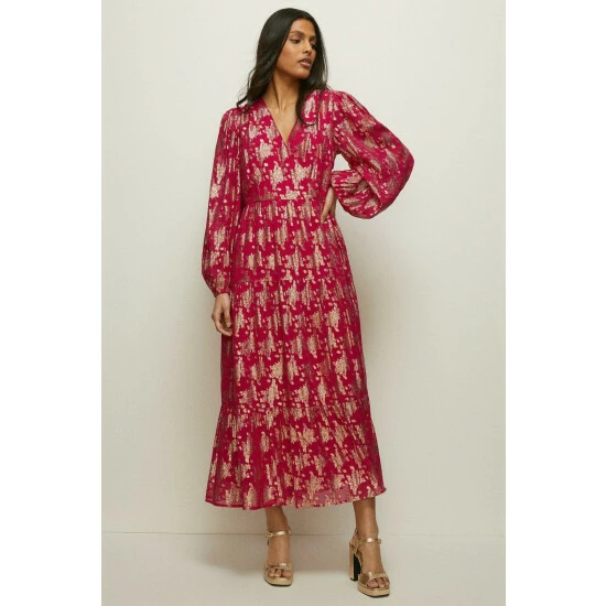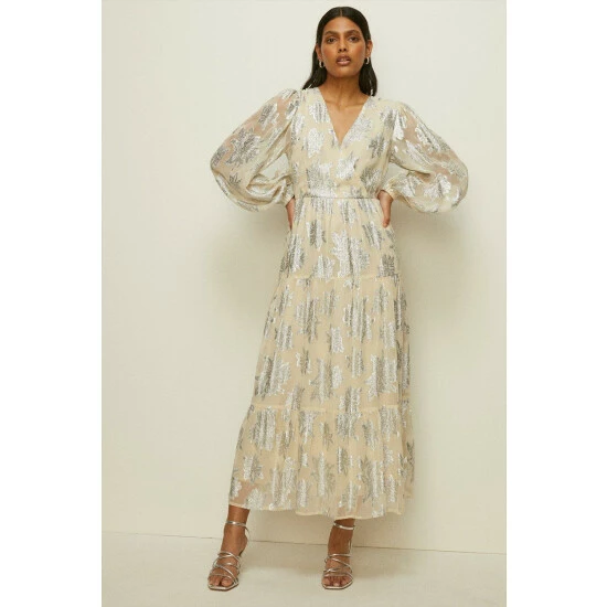 Elevated with an all-over print in a striling metallic finish, this midi dress is designed with a flattering V-neckline, nipped in waist and gently ballooned sleeves. Pair with metallic accessories for a co-ordinated look. Model wears a size 10.