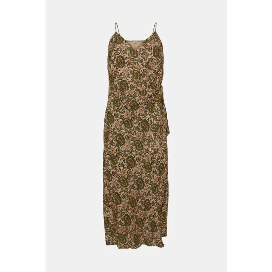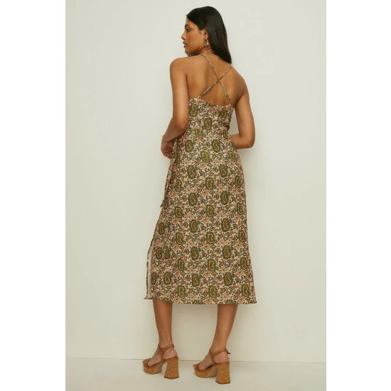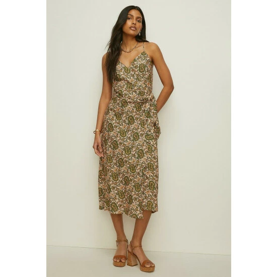 Style: Slip DressDesign: PaisleyLength: MidiNeckline: WrapSleeve Length: Strappy