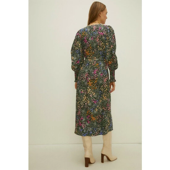 Style: Wrap DressDesign: FloralLength: MidiNeckline: CrewSleeve Length: 3/4 Sleeve