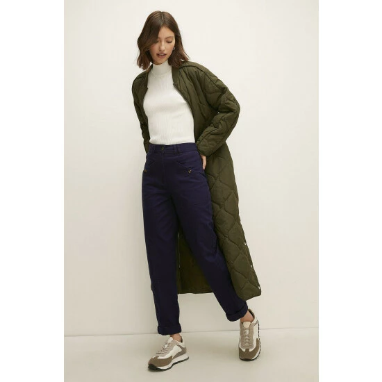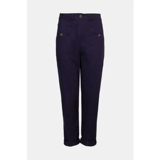 These utility-inspired trousers are designed in a peg style with a flattering high-rise. Complete with practical front pockets and tortoise shell buttons, these trousers look great paired with ankle boots and warming knits for an autumnal aesthetic. Model wears a size 10. This garment is part of our Conscious Clothing rangeFind out more about our material goalsThe Boohoo Group are members of Better Cotton. By choosing our cotton products, you’re supporting Boohoo Groups investment in Better Cotton’s mission.This product is sourced via a system of mass balance and therefore may not contain Better Cotton. Learn more at bettercotton.org/massbalance.Conscious Clothing Guidelines