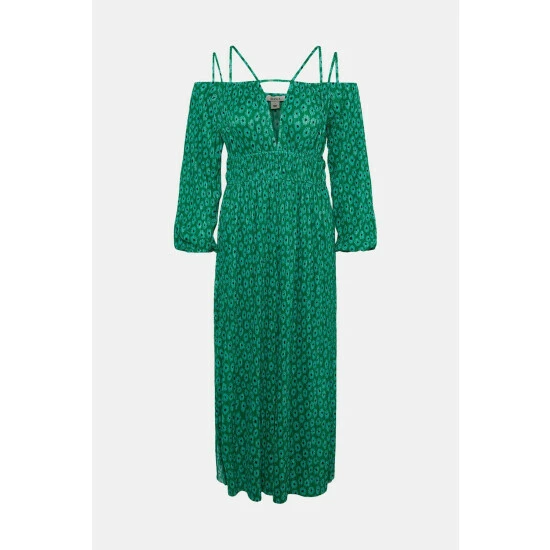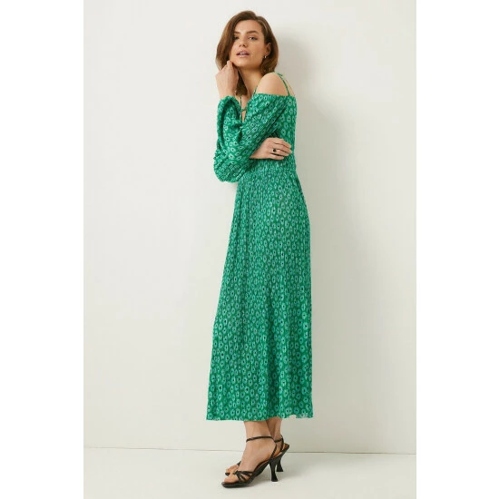 Style: Midi DressDesign: FloralFabric: PlisseLength: MidiNeckline: BardotSleeve Length: Long Sleeve