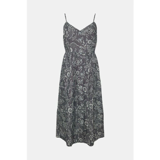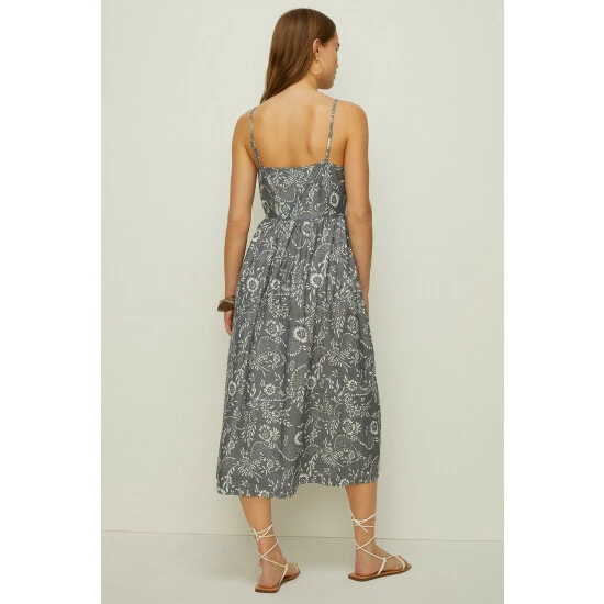 Part of our Petite collection. Meet your new summer hero. Designed in a strappy style with a V-neckline, gently nipped-in waist and full midi skirt, this dress is made for the effortless everyday. Complete with an all-over print, it pairs perfectly with slip-on sandals. Model wears a size 10. This garment is part of our Conscious Clothing rangeFind out more about our material goalsThe Boohoo Group are members of Better Cotton. By choosing our cotton products, you’re supporting Boohoo Groups investment in Better Cotton’s mission.This product is sourced via a system of mass balance and therefore may not contain Better Cotton. Learn more at bettercotton.org/massbalance.Conscious Clothing Guidelines