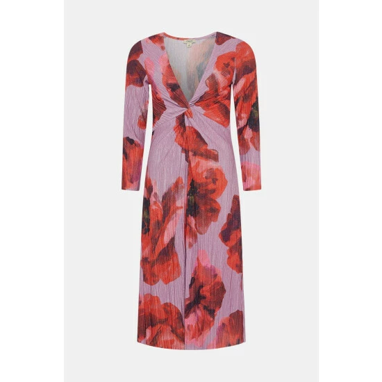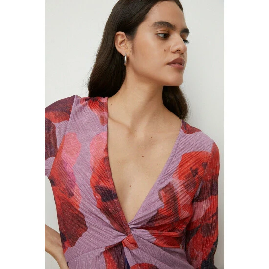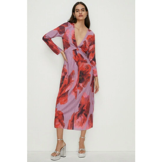 Part of our Petite collection. Beautifully crafted in a shimmering plisse fabric, this elegant midi dress is perfect for the final celebrations of summer. Designed with a plunging V-neckline, a nipped in waist with a unique twist detail and long sleeves. Complete with a bold floral print. Model wears a size 1. Check out our wedding guest dresses range.