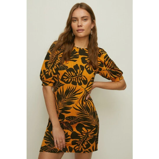 Style: Mini DressDesign: Palm PrintFabric: TexturedLength: MiniNeckline: Crew