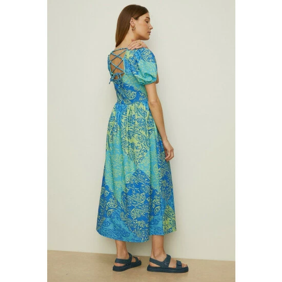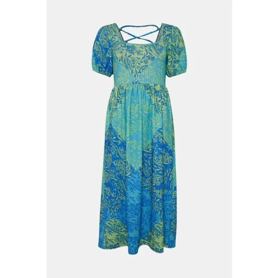 Style: Midi DressDesign: Scarf PrintFabric: TexturedLength: MidiNeckline: SquareSleeve Length: Short Sleeve