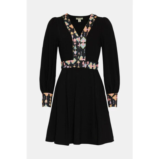 Showing off a flattering skater style that cinches in at the waist, this mini dress is sure to become a go-to for every occasion. Featuring a V-neckline and gently ballooned sleeves, it comes complete with printed trims for instant elevation. Pair with everything from knee-high boots to strappy sandals for endless wearability. Model wears a size 10.