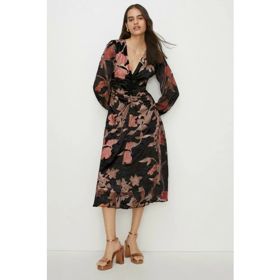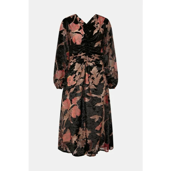 Beautifully crafted in a sumptuous velvet with a devore finish, allow this elegant dress to become your new autumn hero. Showing off a flattering waist-defining fit, this dress is designed with a plunging V-neckline, midi length and balloon sleeves. Complete with ruched detailing and a bold floral print.