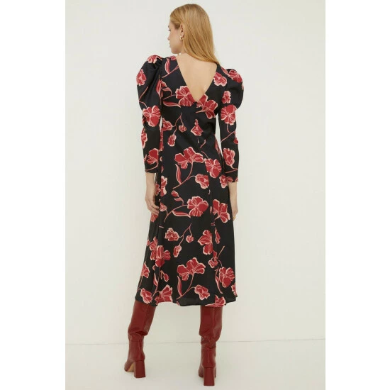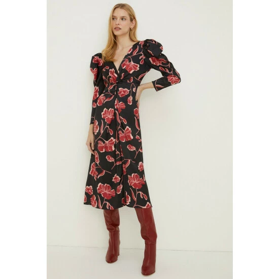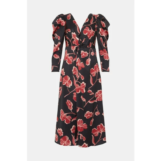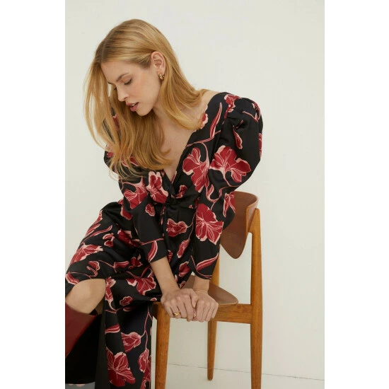 Part of the Oasis by Rachel Stevens collection. Be the guest of honour in this statement-making dress. Abloom with a bold floral print on a sumptuous satin, it’s designed in a midi style with a unique twist detailing at the front and statement puff shoulders. Model wears a size 1. This garment is part of our Conscious Clothing rangeIt is made with recycled polyester.Find out more about our material goalsConscious Clothing Guidelines Check out our wedding guest dresses range.