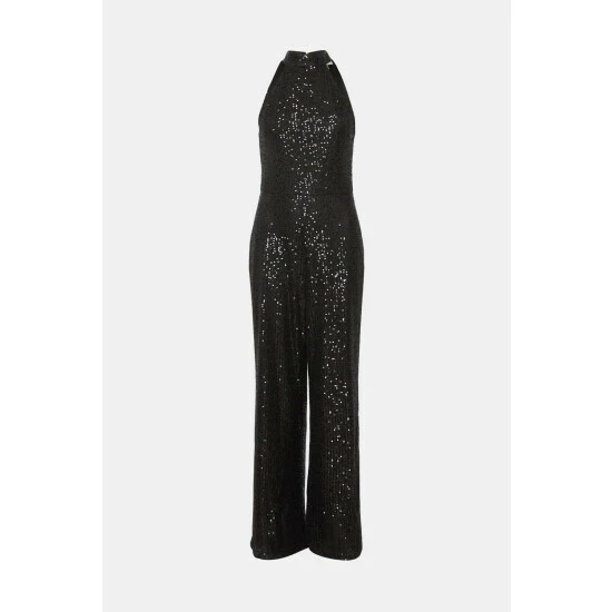 Style: JumpsuitDesign: PlainFabric: SequinNeckline: HalterneckSleeve Length: Sleeveless