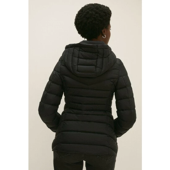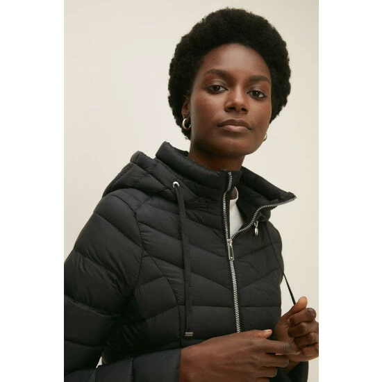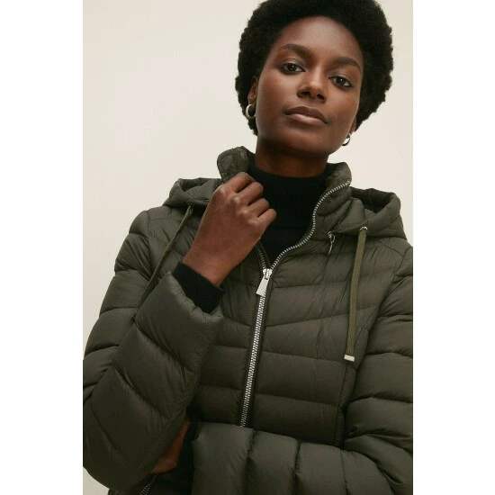 Shell: 52% Pre-Consumer Nylon, 48% Conventional Nylon, Binding: 52% After-Consumer Polyester, 48% Conventional Polyester, Fill: 80% Conventional Down, 20% Conventional Feather, Machine Wash. Model Wears Size 8. Jacket Length 65.5cm