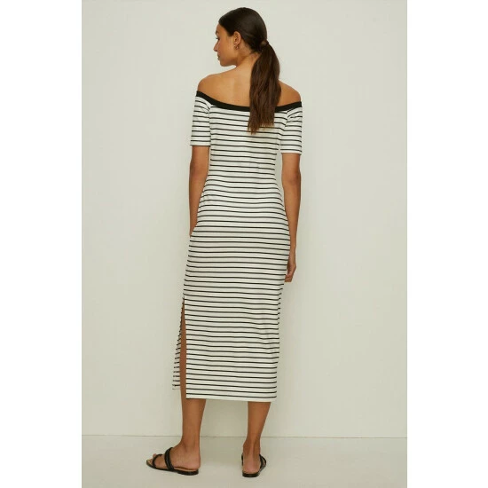 Beautifully crafted in a ponte fabric, this midi dress is designed in a figure-skimming fit with a bardot neckline and short sleeves. Elevated with an all-over striped print and subtle side split. Style with slip-on sandals for effortless everyday style. Model wears a size 10.