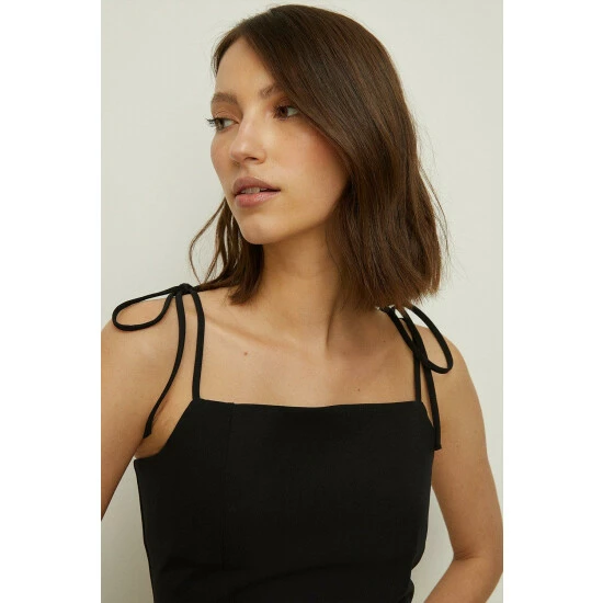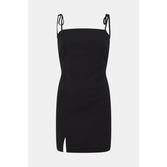 Simple yet striking, this elegant mini dress is designed in a sleek slip style with a square neckline, figure-skimming fit and thin straps with tie detailing. Elevated with a subtle split for added detailing. Model wears a size 10.