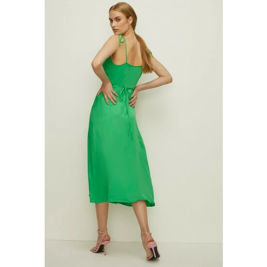 Showing off a flattering wrap fit, this strappy midi dress is an effortlessly chic addition to summer wardrobes. Complete with tie detailing on the straps, this dress pairs just as well with casual sandals as it does with sleek heels for endless wearability. Model wears a size 1. Check out our wedding guest dresses range.